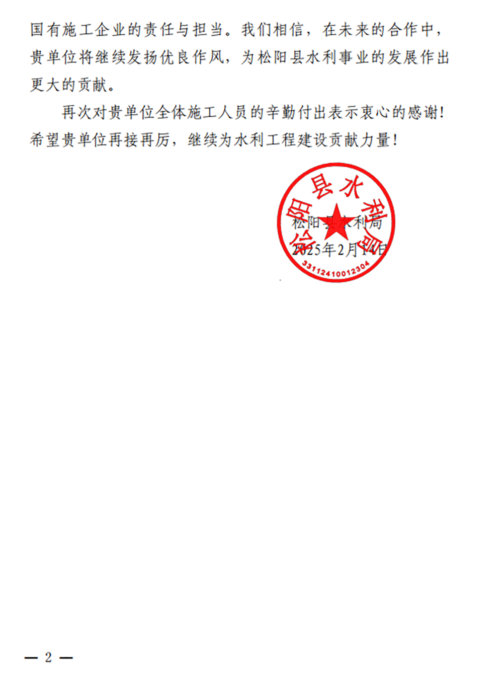 近日,一封来自松阳县水利局的表扬信为“浙钱水建品牌”再添美誉。由浙钱水建承建的松阳县单村水站改造提升工程得到了松阳县水利局的高度赞扬和肯定。信中指出,浙钱水建施工项目团队的出色表现不仅赢得了各参建单位的高度认可,也为松阳县水利基础设施建设树立了标杆。